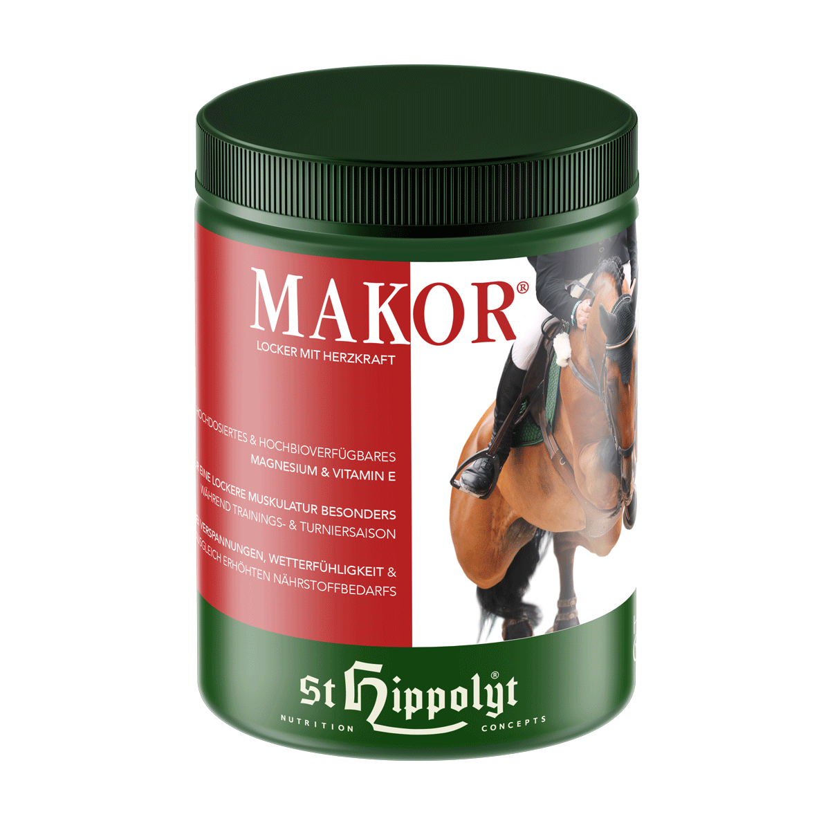 St. Hippolyt Makor ist ein Ergänzungsfuttermittel, das Pferden in Mangelsituationen schnell hochbioverfügbares Magnesium und Vitamin E bereit stellt.