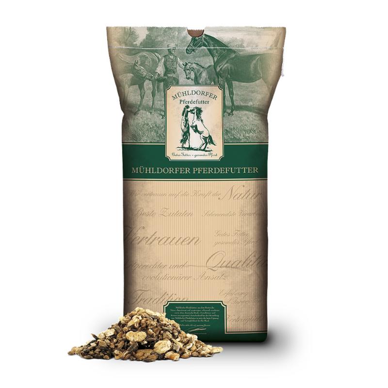 Mühldorfer 6-Korn Plus ist ein hochwertiges Vollkornmüsli mit Schwarzhafer für sportlich aktive Pferde.