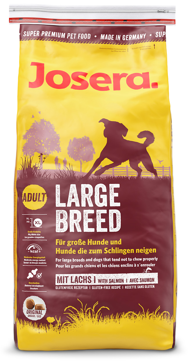 JOSERA Large Breed - dieses Futter ist speziell auf die Bedürfnisse unserer nimmersatten Leckermäuler abgestimmt! Zu hastigem Fressen wird durch die extra großen Kroketten vorgebeugt, die außerdem einen langen Kauspaß bieten. Auch unsere wohlgenährten Schlemmer können durch einen erhöhten Ballaststoffanteil für mehr Sättigung und einen reduzierten Fettgehalt in den Genuss von JOSERA Large Breed kommen.